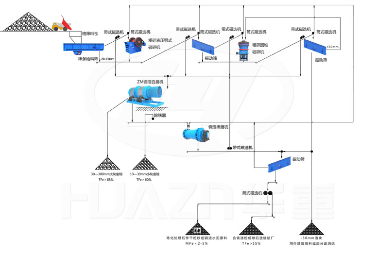 干法鋼渣生產(chǎn)工藝不需要消耗寶貴的水資源,鋼渣經(jīng)破碎、棒磨、磁選后,渣鋼再經(jīng)過自磨可獲得甲等級、乙等級廢鋼,渣粉含鐵品位可達(dá)55%以上,-5~10mm尾渣磁性鐵含量小于2%,沉化處理后可用作鋼渣干粉砂漿或用于制備水泥、鋼渣微粉等。
