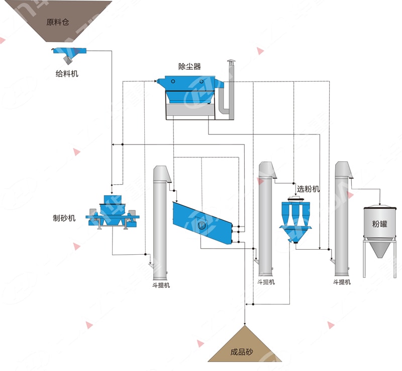 該系統(tǒng)主要用于生產(chǎn)預(yù)拌砂漿用細(xì)砂,設(shè)計(jì)產(chǎn)量為50t/h,原料為-30mm以下的碎石,成品砂細(xì)度模數(shù)2.4-3.0之間可調(diào)整,石粉含量控制在5%-15%,系統(tǒng)配置的核心主機(jī)設(shè)備為洛陽大華生產(chǎn)的PLS1000專用精品制砂機(jī)1臺(tái),該設(shè)備成品粒形好,粒度穩(wěn)定,設(shè)備使用成本低,維修保養(yǎng)簡單。其它配套主機(jī)還有多層細(xì)粒篩分機(jī)1臺(tái),高效選粉機(jī)1套,環(huán)保除塵設(shè)備1套,斗式提升機(jī)3套,粉料罐1套及其它相關(guān)計(jì)量和輸送設(shè)備等。