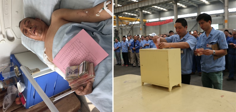 2016年5月14日,我洛陽(yáng)大華重機(jī)公司機(jī)加車(chē)間段慶坤同志在上班路上遭遇車(chē)禍,生命危在旦夕,公司黨支部、工會(huì)在得知消息后為段慶坤同志送去了一部分慰問(wèn)金,同時(shí)在得知段慶坤家庭特別困難時(shí),黨支部、工會(huì)在公司范圍內(nèi)提出倡議為段慶坤同志募集愛(ài)心善款,倡議一經(jīng)發(fā)出就得到了大華重工總公司及各分公司的積極響應(yīng),僅僅兩天共募集善款24860元!當(dāng)段慶坤同志接過(guò)這筆凝聚著大華重工員工愛(ài)心善款時(shí),激動(dòng)不已,表示要積極配合治療爭(zhēng)取早日回到工作崗位,回到這個(gè)團(tuán)結(jié)友愛(ài)的大家庭中!