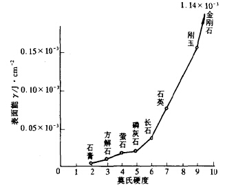 晶體在破碎之前到破碎之后,所接受的是一定的能量△U,所產(chǎn)生的效果是增加了若干新的表面積△S。由于居于物體表面的晶胞所具有的結(jié)合能多于中心部分的晶胞,因此晶體的表面具有表面能。表面能越大,晶體就越堅(jiān)固。圖4給出了幾種標(biāo)準(zhǔn)礦物的表面能數(shù)值,金剛石在〔111〕方向的表面能是0. 114X10-2J/cm2。