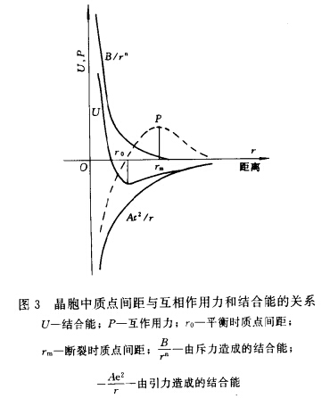 當(dāng)晶體受到外力而被壓縮時(shí),r<r0,這時(shí)斥力增大超過(guò)引力的增大,剩余的斥力支撐著外力的壓迫。當(dāng)晶體受外力作用而伸張時(shí),r<r0引力的減小少于斥力的減小,多余的引力抗御著外力的拆散作用。但隨著質(zhì)點(diǎn)間距的進(jìn)一步增加,引力的絕對(duì)值是減小的,故伸張到一定程度,當(dāng)r =rm 之后(見圖3),質(zhì)點(diǎn)間互作用力P不可能再增大了,晶體終于抵制不住外力的拉伸而被破碎。即是說(shuō),施于晶體上的外力若超過(guò)了最大可能的互作用力,晶體就被肢解了。