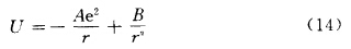 式(14)中的第一項(xiàng)由引力造成,e為質(zhì)點(diǎn)所帶電荷電量;r為質(zhì)點(diǎn)間距離;A為麥德隆常數(shù);第二項(xiàng)由斥力造成,B是和結(jié)晶構(gòu)造有關(guān)的常數(shù);指數(shù)和晶體類型有關(guān),離子型晶體n=9~11,分子型晶體n=2~3。