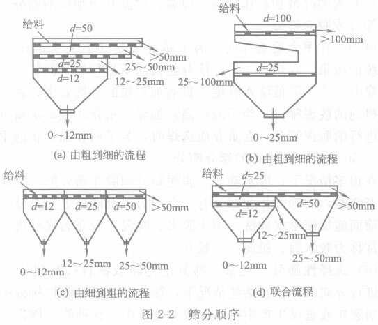 (3)聯(lián)合法:混合篩分。在聯(lián)合流程中,一部分篩面由粗到細(xì)排列,另一部分篩面由細(xì)到粗排列,如圖2—2(d)中,在生產(chǎn)實(shí)踐中,通常使用由粗到細(xì)或聯(lián)合的篩分流程。