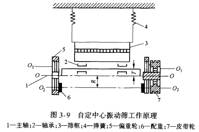 自定中心振動(dòng)篩的工作原理示意圖如3-9所示。與慣性振動(dòng)篩不同的是皮帶輪中心O-O位于軸承中心O1 -O1 與偏心重塊的重心O2 - O2之間。主軸是在與篩箱相連的軸承中轉(zhuǎn)動(dòng),主軸的偏心距為r,等于篩箱在正常工作時(shí)的振幅A。當(dāng)電動(dòng)機(jī)帶動(dòng)皮帶輪7使主軸轉(zhuǎn)動(dòng)時(shí),由主軸偏心所產(chǎn)生的離心慣性力是加在篩箱振動(dòng)系統(tǒng)的內(nèi)力,帶動(dòng)篩箱繞系統(tǒng)的重心作圓運(yùn)動(dòng)。偏重輪5上偏心重塊的質(zhì)量,應(yīng)該保證它們所產(chǎn)生的離心慣性力能夠平衡篩箱旋轉(zhuǎn)時(shí)所產(chǎn)生的離心慣性力。使皮帶輪中心在空間不發(fā)生位移的條件是篩箱旋轉(zhuǎn)(回轉(zhuǎn)半徑等于主軸的偏心距) 產(chǎn)生的離心慣性力與偏心重塊所產(chǎn)生的離心慣性力大小相等,方向相反,此時(shí)達(dá)到動(dòng)力平衡。即