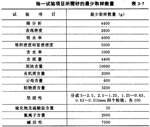 每一單項試驗的試樣應(yīng)不少于表3—7所規(guī)定的最少取樣數(shù)量。需作幾項試驗時,如確能保證試樣經(jīng)一項試驗后不致影響另一項試驗的結(jié)果,可用同一試樣進行幾項不同的試驗。