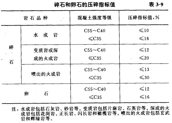 碎石或卵石須具有足夠的強度,以保證混凝土的強度要求。碎石的強度可用巖石的抗壓強度和壓碎指標值表示。巖石的抗壓強度與混凝土強度等級之比不應(yīng)小于1.5,且火成巖強度不宜低于80MPa,變質(zhì)巖不宜低于60MPa,水成巖不宜低于30MPa;炷翉姸鹊燃墳镃60及C60以上時應(yīng)進行巖石抗壓強度檢驗,其他情況下如有懷疑或認為有必要時,也可進行抗壓強度試驗。巖石的抗壓強度首先應(yīng)由碎石生產(chǎn)供應(yīng)單位提供檢驗報告。工程中經(jīng)常性的質(zhì)量控制,可用壓碎指標值檢驗控制碎石的強度,碎石的壓碎指標值宜符合表3-9的規(guī)定。