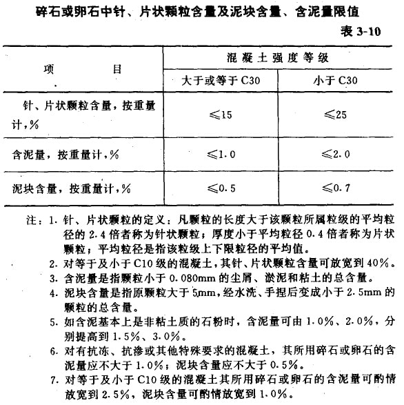 碎石或卵石中針片狀顆粒含量及泥塊含量、含泥量應(yīng)符合表3-10的規(guī)定。