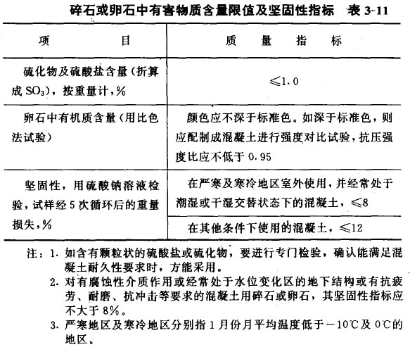 碎石或卵石的堅固性,硫化物和硫酸鹽含量以及卵石中有機雜質(zhì)含量應(yīng)符合表3-11的規(guī)定。