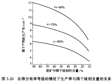 被篩物料的粒度組成,對于篩分過程有決定性的影響,在任何情況下,細?偸潜却至H菀淄ㄟ^篩孔。因此,當(dāng)物料中細級別含量增大時,篩子的生產(chǎn)率也隨之顯著增大。圖3-20所示曲線表示不同篩分效率時的生產(chǎn)率(按篩下產(chǎn)物計算)與原料中細粒級含量之間的關(guān)系。由圖可以看出,當(dāng)原物料中篩下級別的含量由10%增加到90%時,篩子的生產(chǎn)率幾乎增大一倍。這是因為,當(dāng)篩下級別含量大的物料給入篩面時,細粒很迅速地通過篩孔,而留在篩上的物料就很少了, 此時,即使在篩上物料中還有一些"難篩粒",相對地比較容易通過篩孔,因為其他礦粒對它們的影響小。反之,當(dāng)原物料中篩下級別含量少時,因為整個篩面幾乎被篩上產(chǎn)物所占據(jù),妨礙了細粒通過篩孔,因此,在保證篩分效率相等的條件下,按給礦量計算的生產(chǎn)率也就降低了;所以當(dāng)原物料中細級別含量少,而粗級別的粒度又比篩孔尺寸大得多的時候,為了提高篩子的生產(chǎn)能力和延長篩網(wǎng)的使用壽命,可以采用增加輔助篩網(wǎng)的方法,用篩孔尺寸較大的輔助篩網(wǎng),預(yù)先篩除篩上產(chǎn)物過粗的級別,然后用下層篩網(wǎng)對含有大量細級別的物料進行最終篩分,此時,雙層篩作單 層篩使用,只接兩個產(chǎn)品。