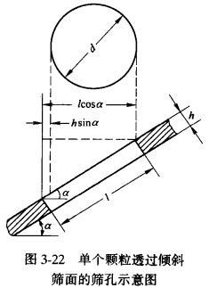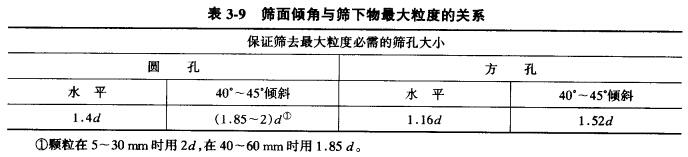 一般情況下,篩子是傾斜安裝的,以便于排出篩上物料。傾角大小要合適,傾角過小,物料在篩面上運動速度太慢,雖然篩分效率高,但篩子的生產(chǎn)率減。环粗,傾角太大,物料排出太快,篩分效率降低。當(dāng)篩面傾斜安裝時,可以讓顆粒順利通過的篩孔尺寸只相當(dāng)于篩孔的水平投影,如圖3-22所示。能夠無阻礙地透過篩孔的顆粒直徑等于d = Icosa - hsina,式中I為篩孔尺寸,h為篩面厚度,a為篩子的傾角。由此可見,篩面的傾角愈大, 使顆粒通過時受到的阻礙愈大。因此,篩面的傾角要適當(dāng)。表3-9所示為篩面的傾角與篩下物最大粒度及篩孔尺寸的關(guān)系。