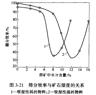 水分對某種物料的篩分過程的真體影響,只能根據(jù)試驗結(jié)果判斷。篩分效率與物料濕度的 關(guān)系見圖3-21。由圖可知,水分對兩種物料的影響是不同的,其原因是這兩種物料具有不同的吸 濕性能。圖中曲線說明,當(dāng)物料含水分達到某一范圍時,篩分效率急劇降低。這個范圍取決于物料性質(zhì)和篩孔尺寸。當(dāng)物料所含水分超過這個范圍后,顆粒的活動性重新提髙,物料的黏滯性反而消失。此時,水分有促進物料通過篩孔的作用,并逐漸達到濕法篩分的條件。這時,物料和水一起進行篩分。