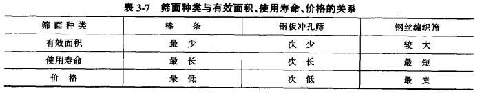 篩子的工作面通常有三種:鋼棒(或條)制造、鋼板沖孔和鋼絲編織。它們對篩分過程的影響,主要和它們的有效面積有關(guān),見表3-7。