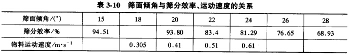 篩面傾角的大小直接影響物料在篩面上的運動速度和篩分效率,如表3-10所示。由此可見,隨著振動篩安裝傾角的增大,篩面上物料的運動速度明顯加快,同時,篩分效率下降。