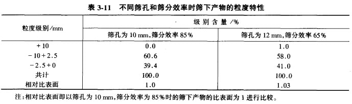 例如用短頭圓錐破碎機(jī)和振動(dòng)篩構(gòu)成閉路破碎中硬礦石時(shí),要求破碎最終產(chǎn)物粒度為10 mm,檢查篩分的篩孔尺寸應(yīng)為10 mm,此時(shí)的篩分效率為85%;但是,也可以采用篩孔尺寸為12 mm,而將篩分效率降低至65% (通過改變篩面傾角或增加給礦量),采用上述兩種篩分工作制度,所得到的篩下產(chǎn)品有著相同的比表面積(單位質(zhì)量的表面積m2/t),即篩下產(chǎn)品有相同的平均粒度。見表3-11。也就是說,篩下產(chǎn)物的質(zhì)最是相等的。