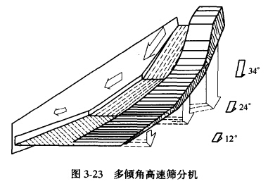 圖3-23為采用等厚篩分法的多傾角高速篩分機(jī)示意圖。它由不同傾角的三段篩面所組成: 第一段34°,第二段24°,第三段12%不同的傾角,適應(yīng)篩子不同部位細(xì)粒物料通過速度的要求, 這樣可以提高生產(chǎn)能力。由圖可見,給料段的物料運(yùn)動(dòng)速度為3~4 m/s,料層薄,物料中細(xì)粒的 60%~70%被篩下。中段速度為1~1.5m/s,末端速度為0.5~0.8m/s,以便使剩余的細(xì)粒有足夠的時(shí)間通過篩孔。因此,在整個(gè)篩面上物料的運(yùn)動(dòng)速度是遞減的,而料層厚度是相等的(或遞增)。在相同生產(chǎn)能力時(shí),篩分面積可以節(jié)省20%~30%,因而使基建和生產(chǎn)費(fèi)用降低。