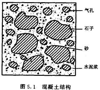 普通混授土是由水泥、砂、石子和水組成。在混凝土中,砂石材料的總含量占總體積的80%以上,主要起骨架作用,稱為骨料;水泥與水形成水泥漿,水泥漿包裹在骨科表面并填充其空隙。在硬化前,水泥漿起潤滑作用,使混援土拌合物具有一定的流動(dòng)性,以滿足施 工的要求。水泥漿硬化后形成水泥石,將骨科膠組成一個(gè)堅(jiān)實(shí)的整體。水泥混凝土的結(jié)構(gòu)如圖5.1。