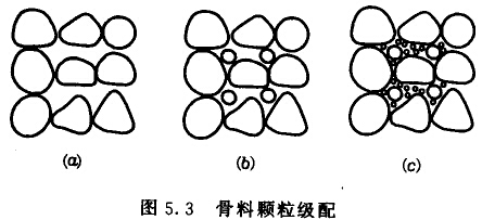 砂的顆粒級(jí)配是指不同大小顆粒的砂子組合情況。一般粗細(xì)均勻的砂粒,其孔隙率較大,但如果各種粒徑的顆粒搭配恰當(dāng),使中等顆粒能填充粗顆粒的空隙,細(xì)顆粒又能填充中等顆粒的空隙,就可以使砂子得到較小的空隙率,如圖5.3所示。因此,砂子的空隙率取決于砂料各級(jí)粒徑的搭配,級(jí)配好的砂子不僅可以節(jié)約水泥,還可以提高混凝土的密實(shí)性及強(qiáng)度。