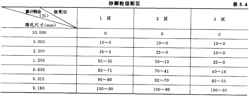 確定砂的級(jí)配狀況以級(jí)配區(qū)為標(biāo)準(zhǔn),砂的級(jí)配區(qū)的確定如下:將紉度模數(shù)為3.7-1.6的砂,按0.63mm篩孔的累計(jì)篩余百分牢劃分為3個(gè)區(qū)。0.63mm在這里稱為控制粒級(jí),它使任何一種砂樣只能處于某一個(gè)級(jí)配區(qū)范圍內(nèi),而不會(huì)同時(shí)局于兩個(gè)級(jí)配區(qū),見表5.4所示。
