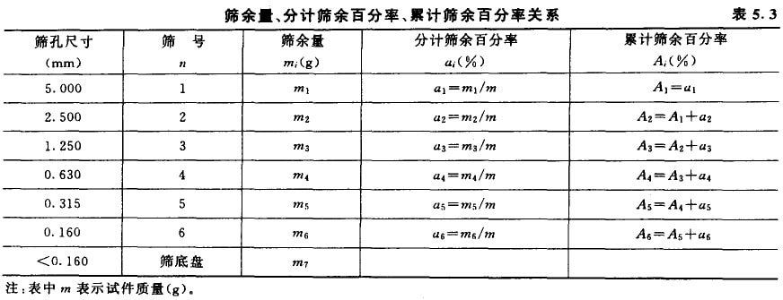砂的粗細(xì)和顆粒級(jí)配的判斷有賴于篩分析試驗(yàn)。篩分析試驗(yàn)是用一套孔徑(凈徑)為5、2.5、1.25、0.63、0.315及0.16mm的6個(gè)標(biāo)準(zhǔn)篩,格500g的干砂試樣由粗到紉依次過篩,然后稱得遺留在各篩上砂子的質(zhì)量,計(jì)算出各篩上的分計(jì)篩余百分率(各篩上篩余量占砂樣總量的百分?jǐn)?shù))及累計(jì)篩余百分率(各篩和比該篩粗的所有分計(jì)篩余百分串之和)。篩余量、分析篩余百分率、累計(jì)篩余百分率的關(guān)系見表5.3。