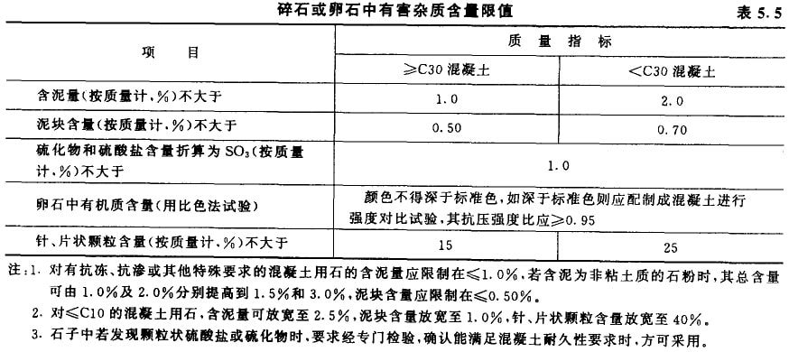 粗骨料中的有害雜質(zhì),主要有粘土、淤泥、有機(jī)質(zhì)、硫化物及硫酸鹽等。它們的危害作用與在細(xì)骨料中的作用相同,它們的允許含量應(yīng)符合表5.5的規(guī)定。