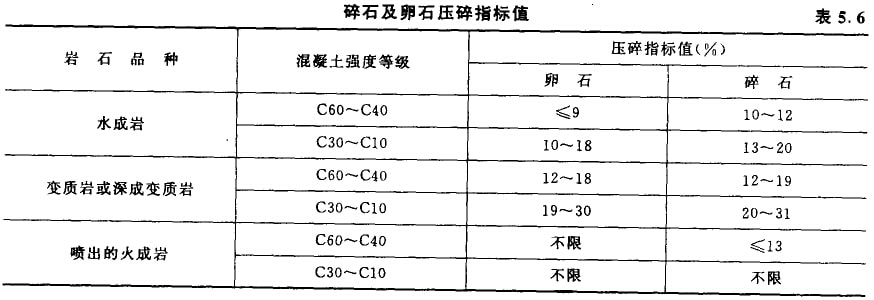 對多種巖石組成的卵石,可對20mm以下和20mm以上的標(biāo)準(zhǔn)粒級(jí)(10-20mm)分別檢驗(yàn),計(jì)算總的壓碎指標(biāo)。碎石及卵石的壓碎指標(biāo)見表5.6。