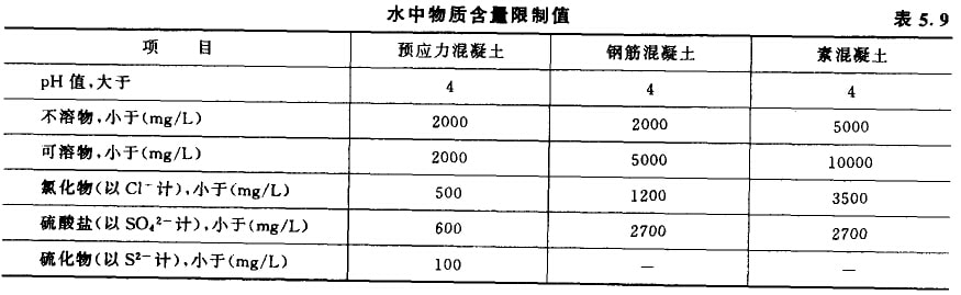 對水質(zhì)有懷疑時(shí),應(yīng)將待檢驗(yàn)水與蒸餾水分別做水泥凝結(jié)時(shí)間和砂漿或混凝土強(qiáng)度對比試驗(yàn)。對比試驗(yàn)測得的水泥韌凝時(shí)間差和終凝時(shí)間差,均不得超過30min,且其韌凝及終凝時(shí)間應(yīng)符合國家水泥標(biāo)準(zhǔn)的規(guī)定。用待檢驗(yàn)水配制的水泥砂漿或混凝土的28d抗壓強(qiáng)度不得低于用蒸餾水配制的對比試件強(qiáng)度的90%。混凝土用水中各種物質(zhì)含量限制值見表5.9。