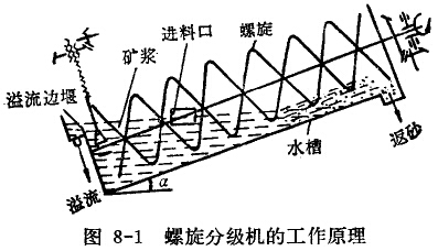 螺旋分級機(圖8-1)通常是由以下幾部分組戊:半圓形的水槽;作為排礦機構(gòu)的螺旋裝置;支承螺旋軸的上、下軸承部;螺旋軸的傳動裝置和螺旋軸的升降機構(gòu)。
