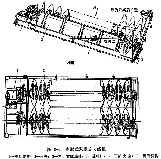 圖8-2為高堰式雙螺旋分級機的結(jié)構(gòu)圖。半圓形水槽2通常用鋼板和型鋼焊成,其側(cè)壁沒有進料口。返砂口介槽體上端的下部。為了在必要時能排出砂漿,水槽下部沒有放水閥,正常工作時關(guān)閉。
