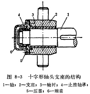 十字形軸頭支座的結(jié)構(gòu)如圖8-3所示。支座兩側(cè)的軸頭支承在傳動架上。這種裝置可以滿足螺旋軸在作旋轉(zhuǎn)運動的同時,又可作升降運動。