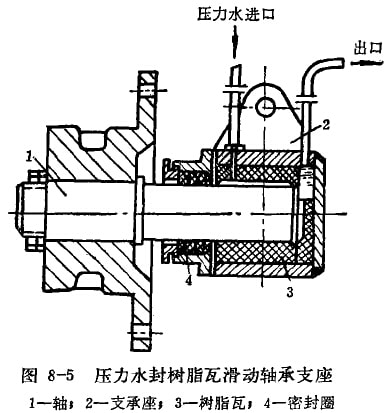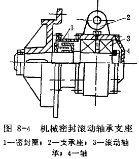 下部支座長期沉沒在礦漿中,因而軸承的密封裝置是保證設(shè)備正常運轉(zhuǎn)的關(guān)鍵問題。目前,常用的下部軸承的密封裝置有三種,即機械密封滾動軸承支座(圖8-4)、壓力水封樹脂瓦滑動軸承支座(圖8-5)及壓力水封橡膠軸襯(一船用皮帶機廢肢帶組疊而成)。這些結(jié)構(gòu)型式的密封性均不夠理想,最近,在機械密封滾動軸承支座的基礎(chǔ)上,用手動干油泵注入高壓油,壽命可達1年左右,其結(jié)構(gòu)如圖8-6所示。