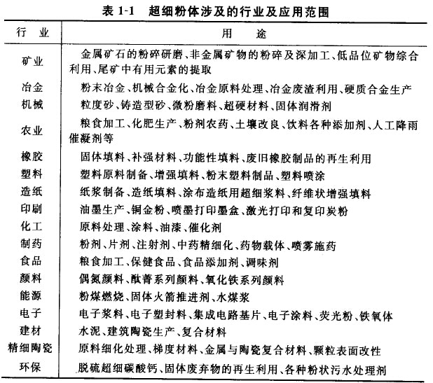 超細(xì)粉體工業(yè)是多學(xué)科的組合,超細(xì)粉體幾乎應(yīng)用于國民經(jīng)濟(jì)的所有部門,表l-l為超細(xì)粉體涉及的行業(yè)及應(yīng)用范圍。