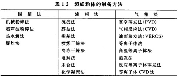 因?yàn)槌?xì)粉體具有優(yōu)良的性能和廣泛的用途,所以人們研制了許多的制備方法。主要制備方法見表1-2。