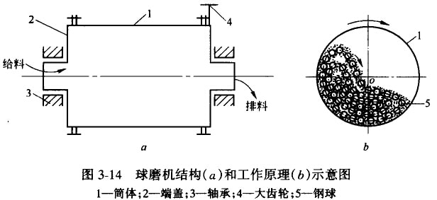 圓筒形球磨機(jī)在細(xì)磨中應(yīng)用員為廣泛,圖3-14所示為球磨機(jī)的結(jié)構(gòu)和工作原理。主要由圓柱筒體、端蓋、中空軸頸、軸承和傳動(dòng)大齒圈等部件組成。筒體內(nèi)裝有直徑為25-150mm鋼球,其裝入且是整個(gè)筒體有效容積的25%-50%。筒體內(nèi)壁設(shè)有襯板,除防止筒體磨損外,兼有提升鋼球的作用,筒體兩端的中空軸頸有兩個(gè)作用:一是起軸頸的支撐作用,使球磨機(jī)全部重量經(jīng)中空袖頸傳給軸承和機(jī)座;二是起給料和排料的漏斗作用。電動(dòng)機(jī)通過聯(lián)軸器和小齒輪帶動(dòng)大齒圈和筒體以一定轉(zhuǎn)速轉(zhuǎn)動(dòng)。