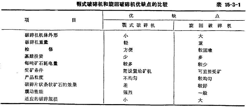 露天礦所用的粗破碎設備,一般都采用顎式破碎機或旋回破碎機。所選用的設備,必須滿足破碎產品粒度和生產能力的要求,也需考慮給礦中的最大粒度不得大于被碎機給礦口的0.85倍。顎式破碎機和旋回破碎機又各有其優(yōu)缺點,故在選擇設備時還要根據具體情況而定,一般礦山規(guī)模較小時宜采用顎式破碎機。顎式和旋回的優(yōu)缺點比較見表15-3-1。