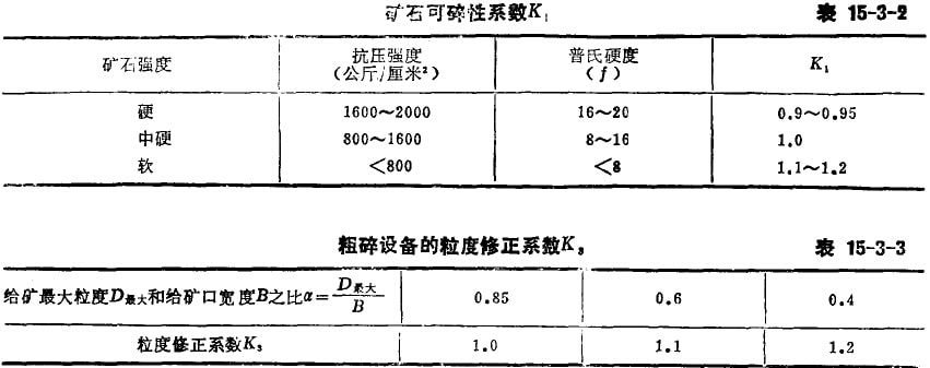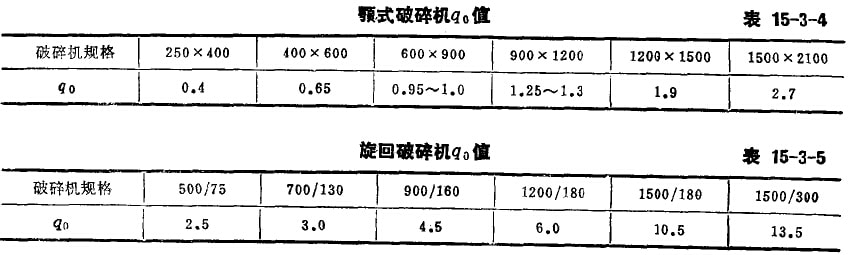 qo——顎式、旋回破碎機單位排礦口寬度的生產能力,噸/毫米·時,查表15-3-4和表15-3-5;
