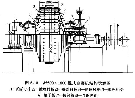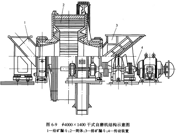干式自磨機(jī)如圖6-9所示。主要由給礦漏斗、筒體、排礦漏斗及傳動(dòng)裝置、潤(rùn)滑裝置等組成。 干式自磨機(jī)與球磨機(jī)比較其結(jié)構(gòu)特點(diǎn)如下:
