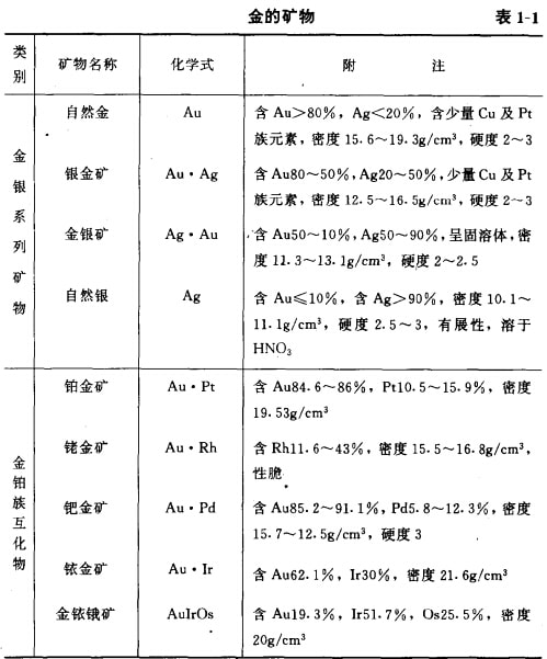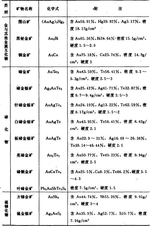 目前在自然界中已發(fā)現(xiàn)的金礦物有98種,何常見的只有47種,而工業(yè)礦物僅有十多種。最主要的是自然金、銀金礦和金銀礦具有工業(yè) 意義,其次是金的碲化物,例如碲金礦、蹄金銀礦,雖然種類較多,分布較廣,但數(shù)量不多,經(jīng)濟價值不大。已發(fā)現(xiàn)的金礦物列產(chǎn)表1-1 。