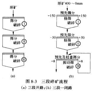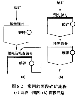 當(dāng)選礦廠生產(chǎn)規(guī)模不大,且第一段碎礦機(jī)生產(chǎn)能力有富余時(shí),第一段可不設(shè)預(yù)先篩分,即選用第一段不設(shè)預(yù)先篩分的兩段一閉路碎礦流程。而兩段開路碎礦流程,只有在某些重力選礦廠將碎礦產(chǎn)物直接送到棒磨機(jī)進(jìn)行磨礦時(shí)才采用。