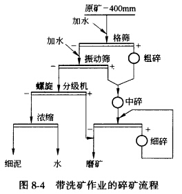 當(dāng)原礦中含泥(-3mm)超過5%~10%和含水量大于5%~8%時(shí),細(xì)粒就會粘結(jié)成團(tuán),惡化碎礦過程的生產(chǎn)條件,造成破碎腔和篩孔的堵塞以及儲運(yùn)設(shè)備出現(xiàn)堵和漏的現(xiàn)象。故應(yīng)在碎礦流程中增加洗礦作業(yè)。增加洗礦,不僅能發(fā)揮設(shè)備潛力,使生產(chǎn)能順利進(jìn)行。并能改善勞動(dòng)條件,提髙有用金屬的回收率,擴(kuò)大資源的利用。