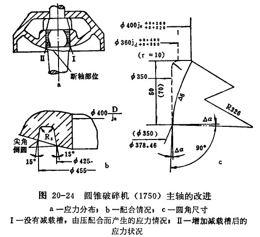 (3)在保證主軸與軀體緊配合,運(yùn)轉(zhuǎn)中不發(fā)生松動(dòng)的情況下,減小主軸與圓錐軀體的配合過(guò)盈,以適當(dāng)緩和應(yīng)力集中。例如舊系列φ1650主軸用D/Jd配合;新系列φ1750破碎機(jī)改為D/j配合(圖20-24b)。