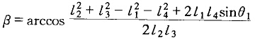 當(dāng)口角為銳角時(shí),肘板為下斜式;當(dāng)β角為鈍角時(shí),肘板為上斜式。肘板為廠斜式的復(fù)擺顎式破碎機(jī),通常傳動(dòng)角β=45°—55°,肘板為上斜式的復(fù)擺領(lǐng)式破碎機(jī),傳動(dòng)角β=105°。對(duì)于簡(jiǎn)擺顎式破碎機(jī),當(dāng)曲柄偏心位置為最高點(diǎn),兩肘板的內(nèi)端點(diǎn)略低于兩外端點(diǎn)的連線(xiàn),即β角近于90°。