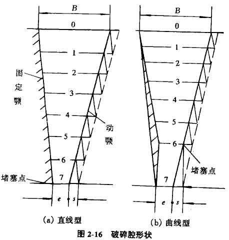 破碎腔形狀設(shè)計(jì)的是否合理,直接影響破碎機(jī)的破碎效果、生產(chǎn)率、能雖消耗、襯板磨損棚破碎比等里要指標(biāo)。破碎腔形狀如圖2-16所示,有直線(xiàn)型破碎腔和曲線(xiàn)型破碎腔。實(shí)踐與理論分析說(shuō)明曲線(xiàn)型破碎腔優(yōu)于直線(xiàn)型破碎腔。因此,采用曲線(xiàn)型破碎腔是現(xiàn)代破碎設(shè)備結(jié)構(gòu)的發(fā)展方向。