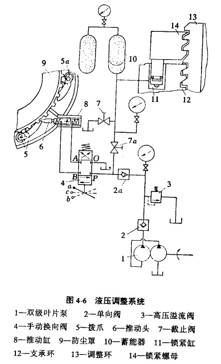 調(diào)整排料口,是靠推動(dòng)缸8,通過(guò)防塵罩9的凸臺(tái),使調(diào)整環(huán)13旋轉(zhuǎn)來(lái)實(shí)現(xiàn)。調(diào)整過(guò)程如下;首先將截止閥7打開(kāi),鎖緊缸11油壓從10MPa降至零,使調(diào)整環(huán)13與支承環(huán)12的連接螺紋放松。然后啟動(dòng)14MPa壓力的雙級(jí)葉片泵1,壓力油通過(guò)單向閥2,高壓溢流閥3(即安全閥,壓力調(diào)到10MPa)和單向閥2a,進(jìn)入三位四通手動(dòng)換向閥4。