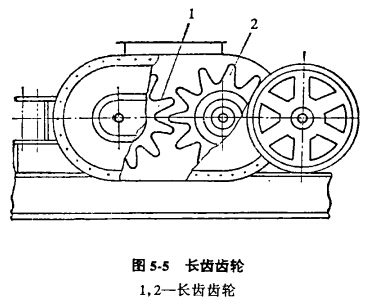 圖5-4所示雙輥破碎機的每個輥子都由單獨的電機帶動。也有使用一臺電機通過皮帶傳動帶動固定輥子,固定輥子袖的另一端裝有齒輪,通過齒輪帶動活動輥子。由于物料性質(zhì)的變化使活動輥子左右移動,所以齒輪齒高必須增加,以防嚙合脫離。雙輥破碎機采用的長齒齒輪傳動如圖5-5所示。它的特點是允許運轉(zhuǎn)中改變中心距而不破壞嚙合特性。