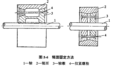 輥式破碎機的輥子由輥面、軸毅、錐形孤鐵、主軸等主要部件組成。軸鼓心部用镕與主軸連接,外表面呈錐形,與輥面的錢孔配合。利用三塊錐面弧鐵、螺桿、螺帽等零件,使輥面與軸教緊緊地結(jié)合在一起。輥面用高錳鋼,鎳硬白口鑄鐵、高銀白口鑄鐵等材料制造。圖5-6是一種輥面與軸毅固定方法的示意圖。