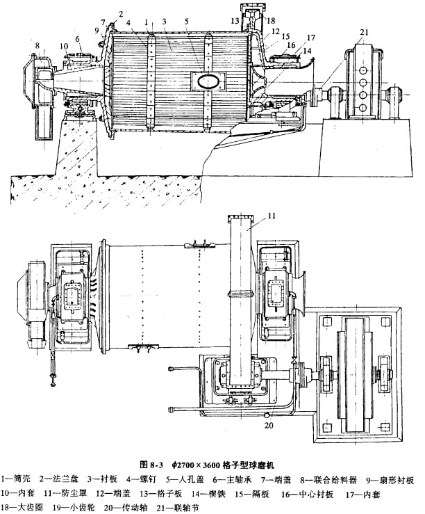 各種類型的球磨機、棒磨機和礫磨機的構(gòu)造基本相同,它們之間僅是個別部件不同而已。φ2700 x 3600格子型球磨機的構(gòu)造如圖8-3所示,它由筒體部、給料部、排料部、軸承部、傳動部和潤滑部六個部分組成。