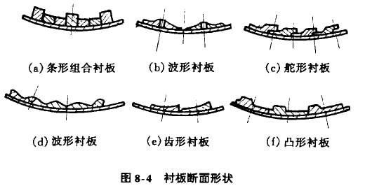 磨機襯板的結(jié)構(gòu)形式及互相間的安放位置,都直接影響著磨機的工作效率。磨機襯板的厚度范圍為50mm-150mm,其結(jié)構(gòu)形式和尺寸,須按磨帆的用途和工作特點,并適當考慮制造、安裝和搬運方便的原則來選取c為保證磨機生產(chǎn)的穩(wěn)定性,要求磨機襯板在被磨損到一定積度時,仍能較好地保持原有的結(jié)構(gòu)特性。如圖8-4所示,為常用的幾種磨機襯板的形式。