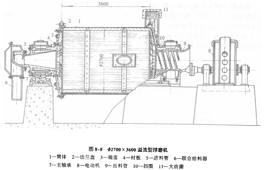 φ2700 x 3600溢流型球磨機(jī)的構(gòu)造如圖8-8所示,除排料部與格子型球磨機(jī)構(gòu)造不同外,其他部分基本相同。