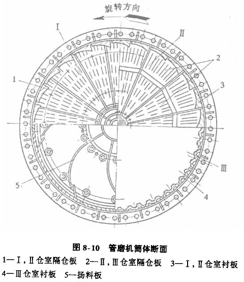 圖8-10是管磨機(jī)筒體的斷面。為了達(dá)到粉磨要求,對各倉室的襯板形式也應(yīng)進(jìn)行適當(dāng)?shù)倪x擇。一般在Ⅰ,Ⅱ倉室中,鋪設(shè)階梯形襯板3;在Ⅲ倉室中,鋪設(shè)波形襯板4。