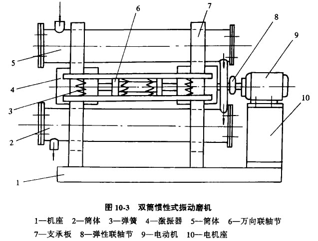 雙筒慣性式振動(dòng)磨機(jī)的構(gòu)造如圖10-3所示。它由機(jī)座1,筒體2,5,彈簧3,激振器4,萬向聯(lián)軸節(jié)6,支承板7,彈性聯(lián)軸節(jié)8和電動(dòng)機(jī)9等組成。雙筒振動(dòng)磨機(jī)的粉磨筒體為串聯(lián)方式上下布置,它們之間通過文承板7互連在一起,而支承板由彈簧3支承在機(jī)座I上。在支承板中部裝有激振器,激振器主動(dòng)上裝有可調(diào)式偏心塊,激振器主鈾通過彈性聯(lián)軸節(jié)與電動(dòng)機(jī)相連接。當(dāng)電機(jī)通過彈性聯(lián)軸節(jié)帶動(dòng)主軸轉(zhuǎn)動(dòng)時(shí),偏心塊產(chǎn)生離心力使筒體產(chǎn)生振動(dòng),物料從上筒體5的—端給入,在筒內(nèi)受到粉磨介質(zhì)的激烈振動(dòng)沖擊磨剝作用粒度變小,并運(yùn)動(dòng)了筒體另一端,從排料門給入到筒體2進(jìn)行粉磨,粉磨達(dá)到產(chǎn)品粒度要求p則從下筒體的誹料口排出。當(dāng)產(chǎn)品粒度要求較粗時(shí),也可采用兩個(gè)筒體并列布置的方式,被磨物料僅通過一個(gè)粉磨筒體,則可獲得兩倍的臺(tái)時(shí)產(chǎn)量。